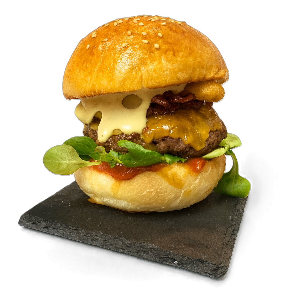 Burger maso, rajčatová salsa, salátek, čedar, cibulové kroužky, slanina, medovo-hořčičná majonéza. A to vše v naší domácí bulce