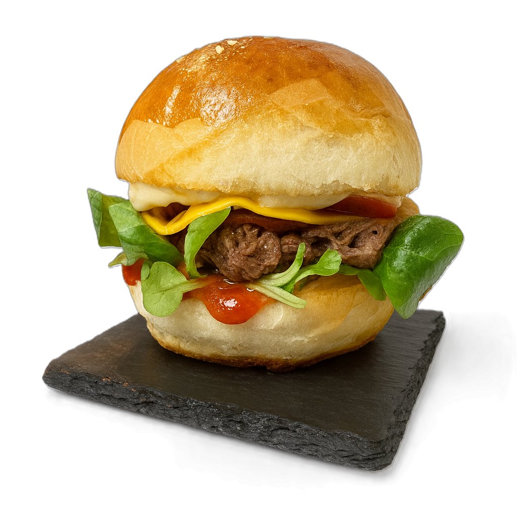 Trhané hovězí maso, rajčatová salsa, salát, čedar, rajče, cibulové chutney, medovo-hořčičná majonéza a domácí bulka