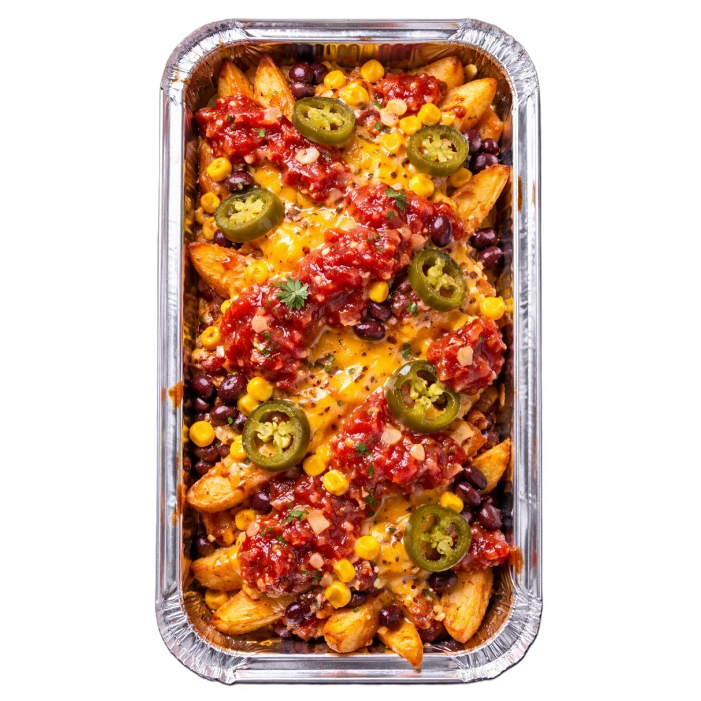 "V" hranolky, čedar, kukuřice, fazole, jalapenos, rajčatová salsa.