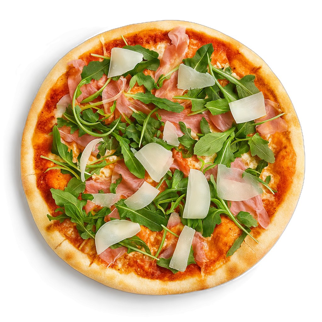 Tenké těsto s rajčatovým základem, navrchu jemná mozzarella, voňavé prosciutto crudo, štiplavá rukola a parmazánové hoblinky. Elegantní klasika s italským šmrncem (a bez falešné skromnosti).