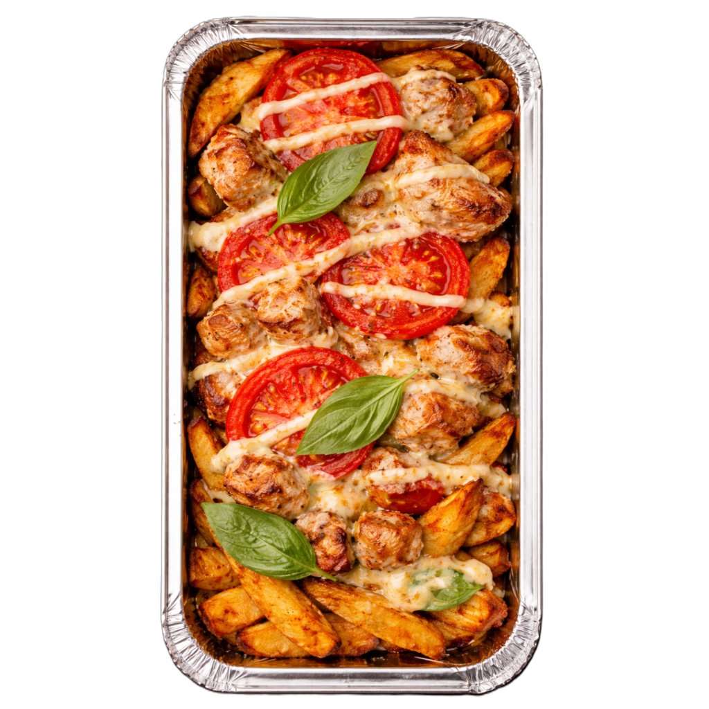 "V" hranolky, grilované kuřecí maso, rajče, mozzarella, čerstvá bazalka, medovo-hořčičná majonéza.